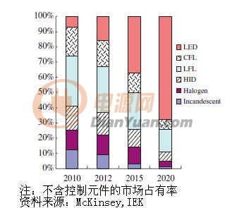 近年来由于LED 价格不断下滑、发光效率不断提高,使得LED 得以进入照明市场,但受限于LED 价格仍偏高、产业标准未定,与光形、寿命、可靠度等技术问题尚待解决, 2010 年LED 照明市场仅33.8 亿欧元,预计2012 年将成长至93 亿欧元左右。就产品型态, LED 产品又可分为LED灯泡、LED 模块及LED 灯具/ 系统。LED 灯泡于2011 年因日本311 大地震的缺电影响,在日本市场快速渗透,进而带动厂商积极推出相关产品,成为近两年来LED 照明中,成长最为快速的产品,预计2012 年LED 灯泡市场规模约24 亿欧元,但由于LED 寿命长,因此在市场饱和之后难以再大幅成长,估计2015 年之后,市场成长将趋缓。LED 模块可以提高产品弹性及降低灯具成本,但是LED 模块尚未标准化,呈现少量、多样的情形,但这也为中小企业提供了一定的空间。
