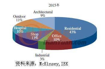 照明市场可分为替换市场及新设置市场,替换市场意指当使用的灯具因光源损坏,购买新的光源替换;新设置市场则指当一栋新建筑物完工后即有照明需求。举例来说,当台灯光源坏掉,购买省电灯泡更换,即称为替换市场,相对地,当家里无台灯,对于台灯有需求而购置一盏台灯,即称为新设置市场。新设置市场与替换市场约80:20 ,但随着LED 渗透率成长与光源技术提升,光源寿命变长,替换照明市场在2015 年后呈现萎缩的趋势。
